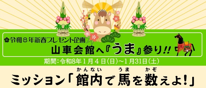 『令和8年新春プレゼント企画 山車会館へ“うま”参り』期 間:令和8(2026)年1月4日(日) ~ 1月31日(土)内 容:令和8年の干支「午年(うまどし)」にちなんだお楽しみ企画です。 山車会館の館内で馬を数えてプレゼントをゲットしてください。